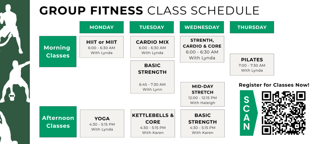 Classes will vary in intensity and difficulty, all exercises can be modified to fit your activity level. Talk to the instructor about showing you modified exercise moves to best fit your ability. All classes include a warm-up and cool down!